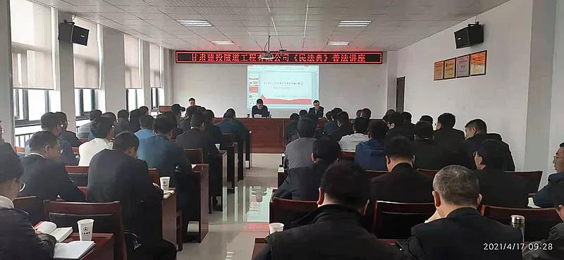 4月17日上午,隧道公司法律事务部组织了2021年度第一期法律知识培训班,特邀甘肃雷奇律师事务所王伟东律师对《民法典》总则部分进行了讲解。公司领导班子,机关各部门负责人,法律事务部、市场开发部、工程预(结)算部全体人员,基层单位领导班子以及部分项目经理共计60余人参加培训。