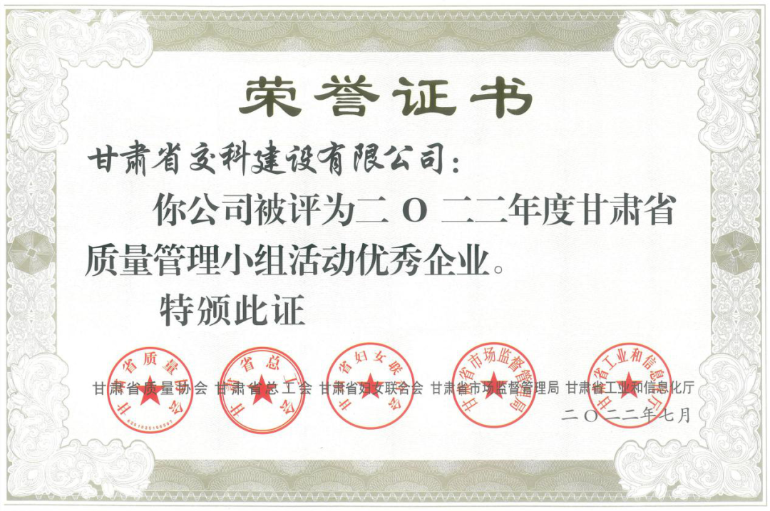 截至目前,交科公司连续三年荣获“甘肃省质量管理小组活动优秀企业”荣誉称号,共拥有省级QC成果特等奖2项、一等奖18项、二等奖3项。