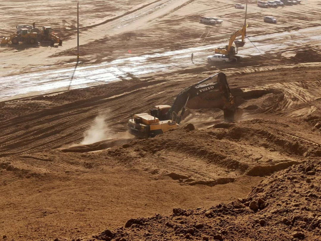 为全力以赴抢工期、促进度,推动项目建设提速、提质、提效,项目部按照“一手抓安全、一手抓建设”的要求,倒排工期,挂图作战,加强机械、人员配置,实现多个工作面同步施工。目前现场施工配备挖掘机37台、装载机13台、推土机6台、洒水车12辆、压路机3台、平地机4台、土方车10辆。所有人员、机械“白+黑”24小时运转,确保施工进度全速推进。截至目前,现已完成土方量390万方,占总土方量的98%。