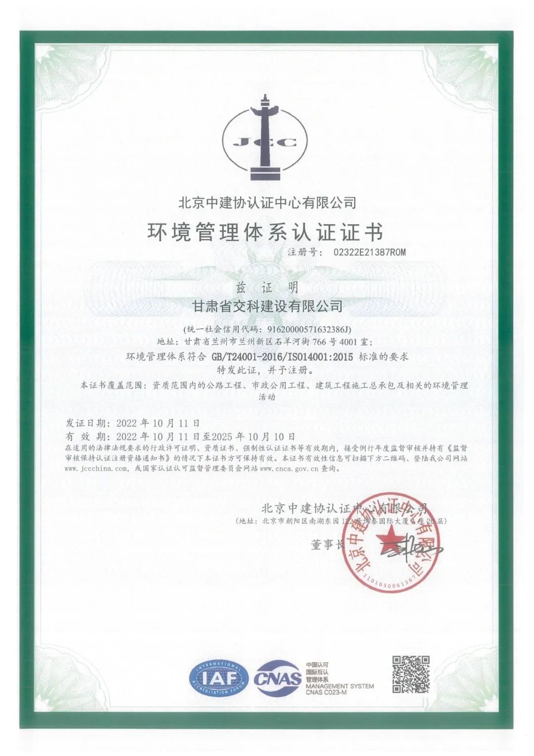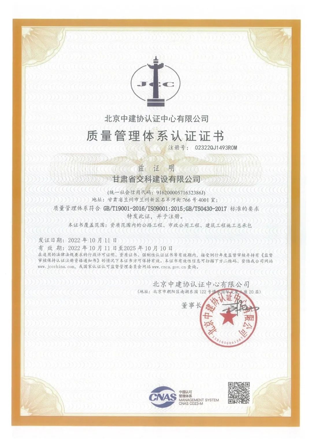 近日,甘肃省交科建设有限公司顺利通过北京中建协认证中心“三体系”一、二阶段审核,并顺利取得审核中心颁发的质量、环境、职业健康安全管理体系认证证书。