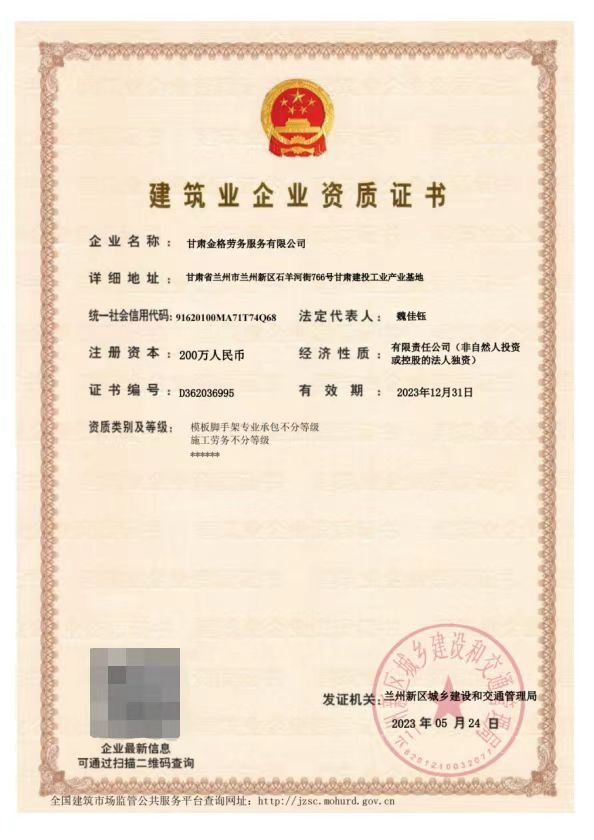 近日,经兰州新区城乡建设和交通管理局批准,金格劳务公司成功增项模板脚手架专业承包不分等级资质。
