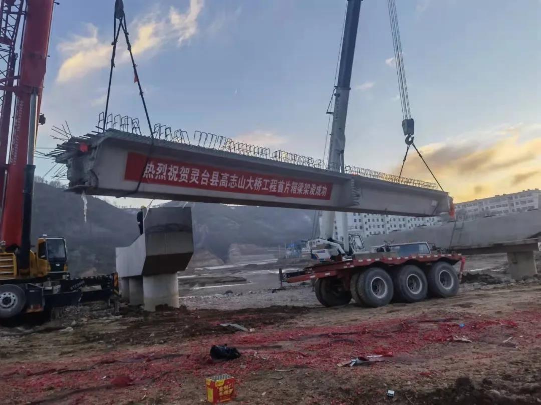 11月8日,万里晴空,一阵鞭炮声中,随着两台大型起吊设备缓缓升起、平稳移动,重达近60T,长20m的预应力混凝土预制箱梁精准落在了墩台上,为高志山大桥49片预制箱梁的架设实现了良好的开局,标志着项目桥梁建设施工取得了突破性进展。