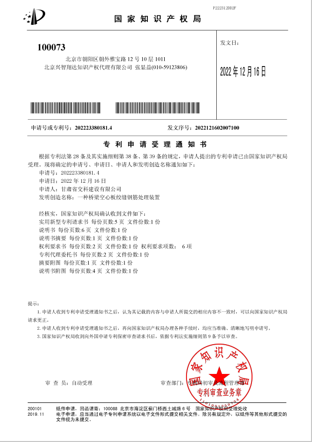 近日,交科公司二公司申报的《一种桥梁横隔板安装吊篮机构》荣获国家知识产权局实用新型专利授权,《一种桥梁空心板绞缝钢筋处理装置》成功被国家知识产权局受理。