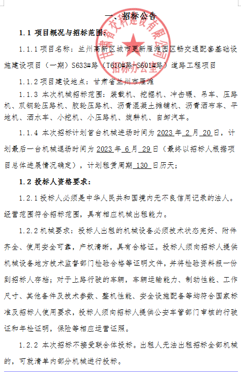 兰州高新区城市更新雁滩园区畅交通配套基础设施建设项目(一期)S633#路(T610#路-S601#路)道路工程项目机械租赁招标公告