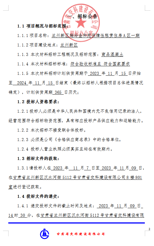 兰州新区瑞岭金和苑保障性租赁住房A区一期-混凝土招标公告