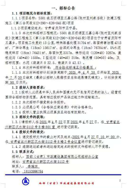 S501线五顷塬至三嘉公路(张村至刘家店段)改造工程施工(第二合同段K12+290-K26+045段)项目水泥招标公告