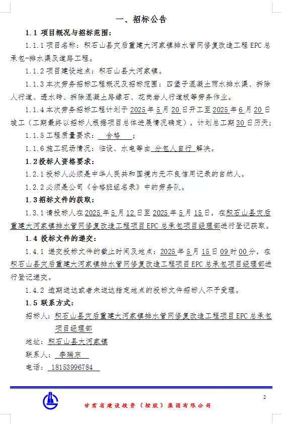 积石山县灾后重建大河家镇排水管网修复改造工程EPC总承包-排水渠及道路工程-劳务分包招标公告