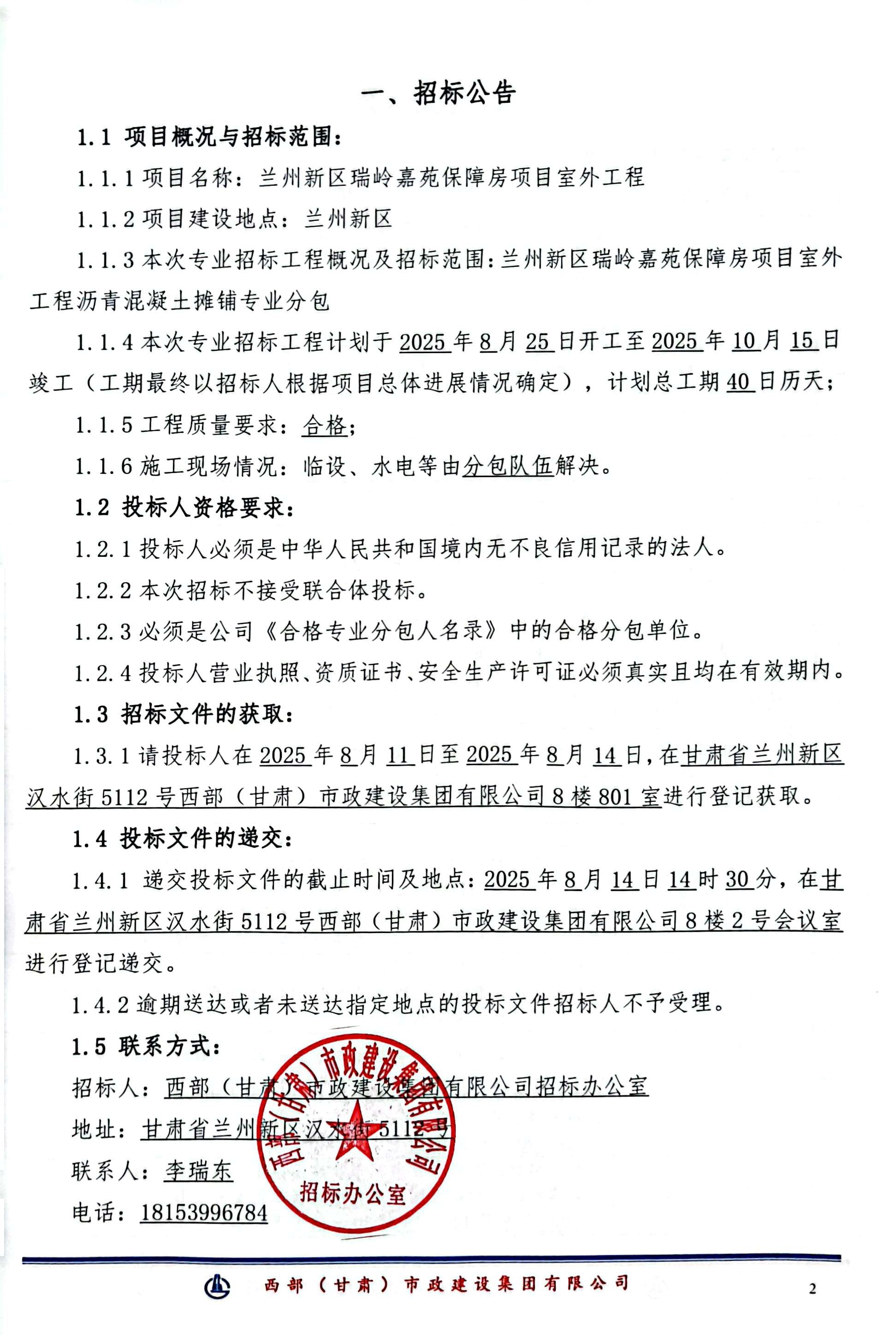 兰州新区瑞岭嘉苑保障房项目室外工程沥青混凝土摊铺专业分包-招标公告