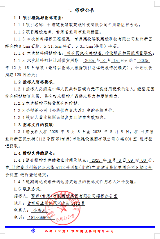 <h3>甘肃建投路政建设科技有限公司兰州新区拌合站-材料招标公告</h3>