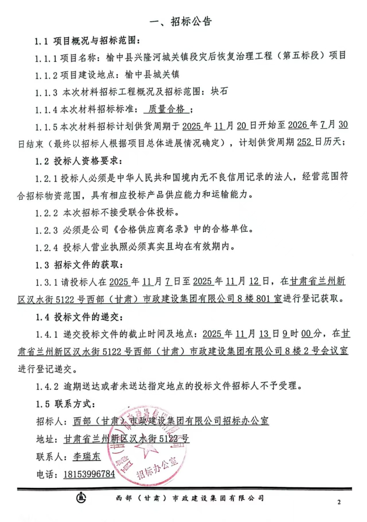 榆中县兴隆河城关镇段灾后恢复治理工程(第五标段)项目-块石招标公告